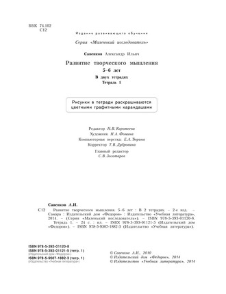 | Содержание: Это издание входит в комплект тетрадей «Маленький исследователь» с развивающими заданиями и упражнениями для обучения дома и в детском саду. Автор комплекта – доктор психологических наук, доктор педагогических наук, профессор Александр Ильич САВЕНКОВ. Самые глубокие и прочные знания – это знания, полученные самостоятельно, в результате исследовательского поиска. Чтобы личность маленького человека гармонично развивалась, важно научить ребенка мыслить логически и вместе с тем нестандартно, творчески. На достижение этих целей и направлены задания предлагаемых тетрадей. С помощью заданий и упражнений тетрадей "Развитие творческого мышления" дети развивают навыки оригинального мышления, прослеживают связи между событиями и явлениями, творчески разрабатывают идеи, учатся гибкости мышления. | |