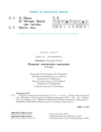 | Содержание: Тетрадь входит в УМК "Я - исследователь", состоящий из рабочей тетради для младших школьников «Я – исследователь», тетрадей для специальных занятий по развитию логического, творческого мышления и познавательных способностей и методического пособия. Автор комплекта – доктор психологических наук, доктор педагогических наук, профессор Александр Ильич САВЕНКОВ. Тетради предназначены для работы дома и в школе, для специальных занятий по развитию логического, творческого мышления и познавательных способностей, элементарных умений и навыков самостоятельного поиска новых знаний. С помощью заданий и упражнений тетрадей "Развитие логического мышления" дети учатся выстраивать строгие логические ряды, классифицировать предметы, находить закономерности в расположении фигур, развивают объемно-пространственное мышление, тренируют зрительную память, внимательность, улучшают мелкую моторику. | |