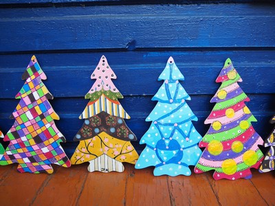 В рамках фестиваля были расписаны деревянные елочки, которыми будет украшена новогодняя ель в усадьбе.