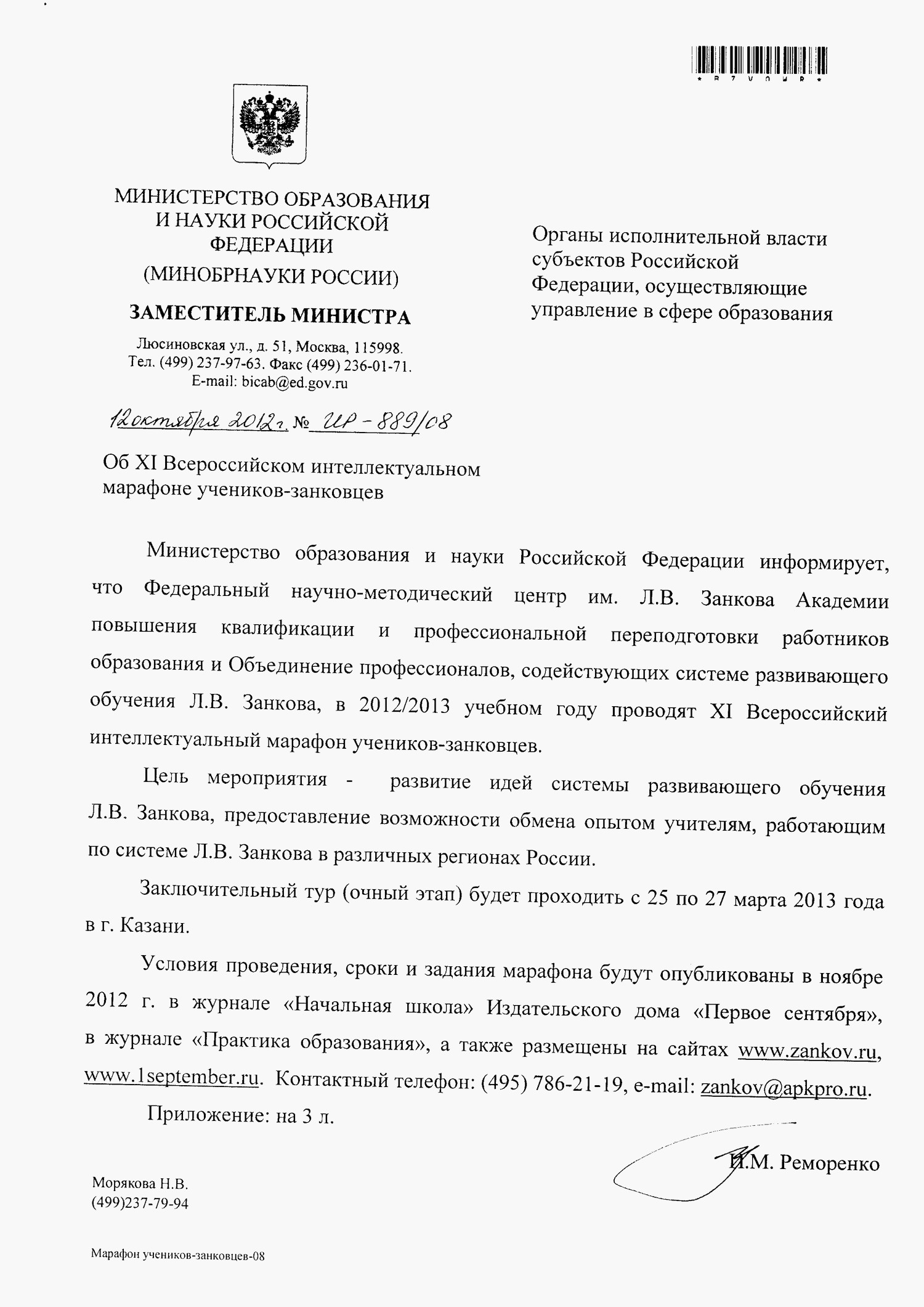 заместителя министра образования и науки Российской Федерации И.М. Реморенко о проведении в 2012/2013 учебном году XI Всероссийского интеллектуального марафона учеников-занковцев.