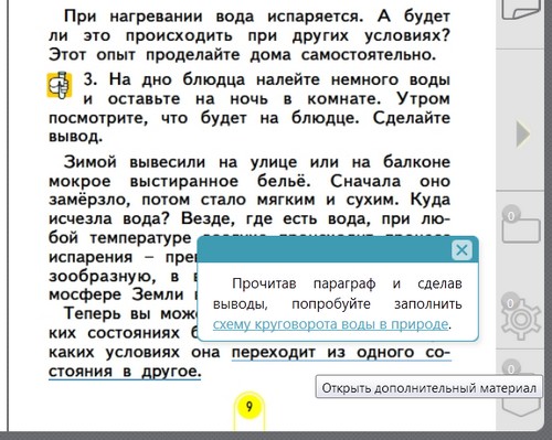 Создатели снабдили страницы электронного учебника дополнительным методическим комментированием текста. При нажатии на размеченные элементы возникают всплывающие окна, которые содержат толкование непонятных слов, подсказки, дополнительные вопросы или комментарии по ходу изложения материала.