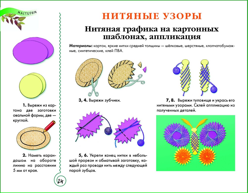 При работе с этими пособиями ребенок сначала наблюдает, анализирует изображение поделки, пытается понять, как она выполнена, из каких материалов. Далее он должен определить основные этапы работы и их последовательность, обучаясь при этом навыкам самостоятельного планирования своих действий. В большинстве случаев основные этапы работы показаны в виде схем и рисунков, однако дети имеют возможность предлагать свои варианты, пытаться усовершенствовать приемы и методы, учиться применять их на других материалах, допускаются варианты как упрощения, так и усложнения задания.
