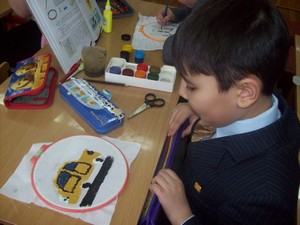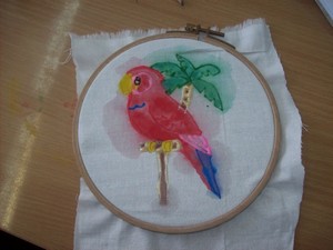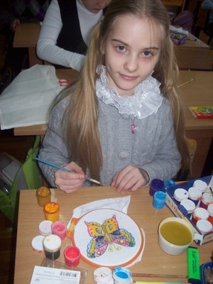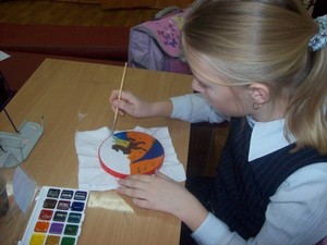 Оборудование: учебник «Технология. Ручное творчество. 4 класс» (авт. Цирулик Н.А., Хлебникова С.И., Нагель О.И., Цирулик Г.Э.), белая ткань, гуашь, клей ПВА, витражные краски (по желанию), пяльцы или коробка с резинкой, карандаш, копировальная бумага, спички или зубочистка.