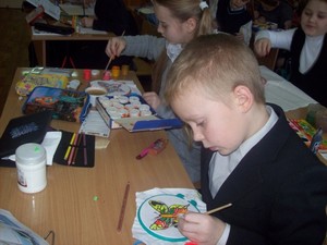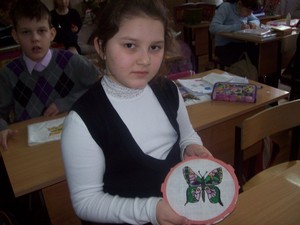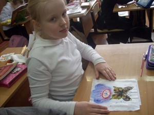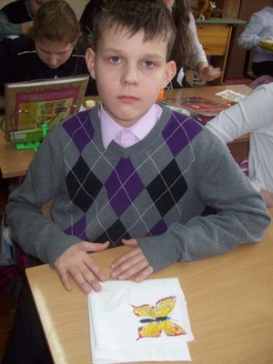 Учитель обращает внимание на то, что крылышки бабочки симметричны относительно её тела. Симметричные детали нужно раскрашивать одинаковым цветом. Чтобы работа получилась интересной, яркой, ребятам предложено тщательно продумать цветовое соотношение деталей рисунка, сочетать цвета по контрасту и тону. С большим удовольствием дети работали. По их признанию, это был один из самых интересных уроков. Саша Е., Коля М., Катя Д., Лиана К. Выполнили работу точно по инструкции. Работы получились у них яркие, красочные, аккуратные. Шахзод любит технику, он нарисовал машину и раскрасил её, получилось очень хорошо. Олеся Л., Вероника П., Лера Б. нарисовали целые сюжетные картины, с восторгом делились впечатлениями после урока. Ребята задумались, как оформить до конца эту работу. Большинство ребят использовали покупные рамочки и поставили свои работы на письменные столы, либо подарили родным и близким. Часть ребят сделали рамочки из картона в виде окошка. В нашем классе есть истинный ценитель этого вида насекомых. Коля М. интересовался насекомыми с самого раннего детства, первую коллекцию бабочек он начал собирать в 3 года. В конце урока ребята с интересом послушали рассказ о его наблюдениях над бабочками. Мне понравилась инструкция в учебнике. Изложен материал предельно доступно. Прочитав его, дети смогли справиться с работой практически самостоятельно. На следующем уроке мы продолжили работу в технике батика.