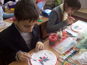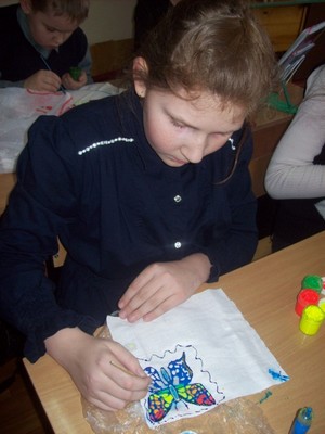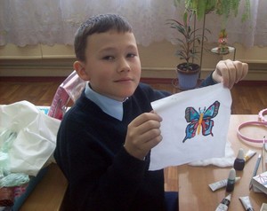 Учитель обращает внимание на то, что крылышки бабочки симметричны относительно её тела. Симметричные детали нужно раскрашивать одинаковым цветом. Чтобы работа получилась интересной, яркой, ребятам предложено тщательно продумать цветовое соотношение деталей рисунка, сочетать цвета по контрасту и тону. С большим удовольствием дети работали. По их признанию, это был один из самых интересных уроков. Саша Е., Коля М., Катя Д., Лиана К. Выполнили работу точно по инструкции. Работы получились у них яркие, красочные, аккуратные. Шахзод любит технику, он нарисовал машину и раскрасил её, получилось очень хорошо. Олеся Л., Вероника П., Лера Б. нарисовали целые сюжетные картины, с восторгом делились впечатлениями после урока. Ребята задумались, как оформить до конца эту работу. Большинство ребят использовали покупные рамочки и поставили свои работы на письменные столы, либо подарили родным и близким. Часть ребят сделали рамочки из картона в виде окошка. В нашем классе есть истинный ценитель этого вида насекомых. Коля М. интересовался насекомыми с самого раннего детства, первую коллекцию бабочек он начал собирать в 3 года. В конце урока ребята с интересом послушали рассказ о его наблюдениях над бабочками. Мне понравилась инструкция в учебнике. Изложен материал предельно доступно. Прочитав его, дети смогли справиться с работой практически самостоятельно. На следующем уроке мы продолжили работу в технике батика.