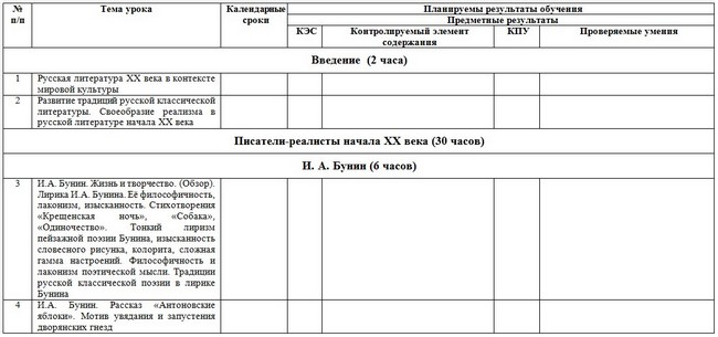 Календарно-тематическое планирование уроков по литературе в 11 классе (фрагмент)