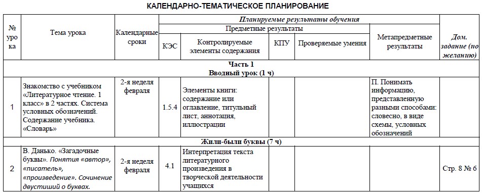 Календарно-тематическое планирование уроков по литературному чтению в 1 классе