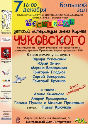 7 декабря в Центральном Доме Литераторов состоится торжественная церемония закрытия Восьмого Московского фестиваля детской литературы имени Корнея Чуковского и вручения литературной премии имени Корнея Чуковского-2014.