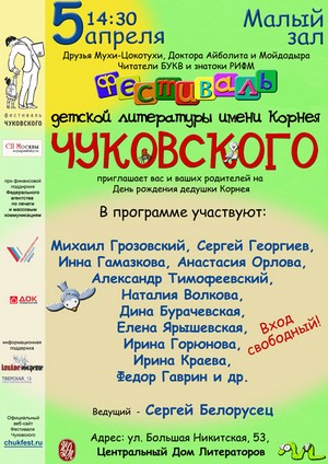 Само же торжественное открытие девятого московского фестиваля детской литературы имени Корнея Чуковского в рамках детского литературного праздника под названием «День рождения дедушки Корнея» состоится в воскресенье, 5 апреля 2015 года, в Малом зале Центрального Дома Литераторов (Большая Никитская улица, д. 53) и начнётся в 14.30. Вход свободный.