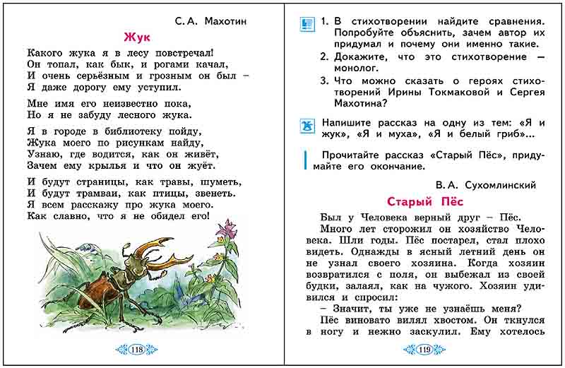 – Он "топает, как бык", значит, он большой и сильный. И "рогами качает", наверное, ему не нравится эта встреча, и он пытается себя защитить. Ведь автор дальше говорит, что он "серьезным и грозным был". Но он ничего не говорит! Во второй части мальчик уже приехал в город, пошел в библиотеку и нашел жука – на рисунке в книге. Тут он тем более молчит.