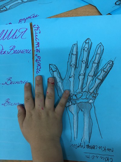 Кисть руки. Вначале обвели свою ладонь и затем, вырисовывали кости - строение кисти. После такого знакомства ребёнок уже никогда не нарисует руки-палочки.