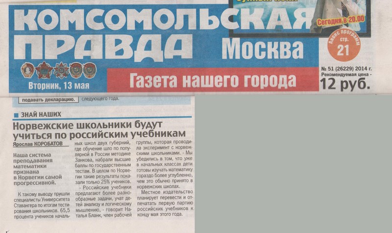 Доцент университета Ставангера Наталья Бланк - один из создателей проекта. Она тестировала российскую учебную программу в начальных школах в Рогаланде и Хордаланде в течение четырех лет. «Наш опыт показывает, что дети готовы изучать математику на более высоком уровне и с более быстрым прогрессированием, выше существующей в норвежских школах нормы, - говорит Н. Бланк. - Российские учебники написаны квалифицированными математиками и задания в них значительно более разнообразны, чем в норвежских учебниках. Ученики могут объяснить и доказать решение задания».